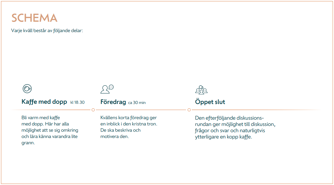 Kvällarna syftar till att ge dig en inblick i den kristna tron. Vi vill visa dig vad Bibeln verkligen lär ut och vad den inte lär ut. Varför vi tror att Gud skapade världen och fortfarande styr den. Och vi vill prata om hur tron på Gud ger oss styrka och mod för nutiden och framtiden.